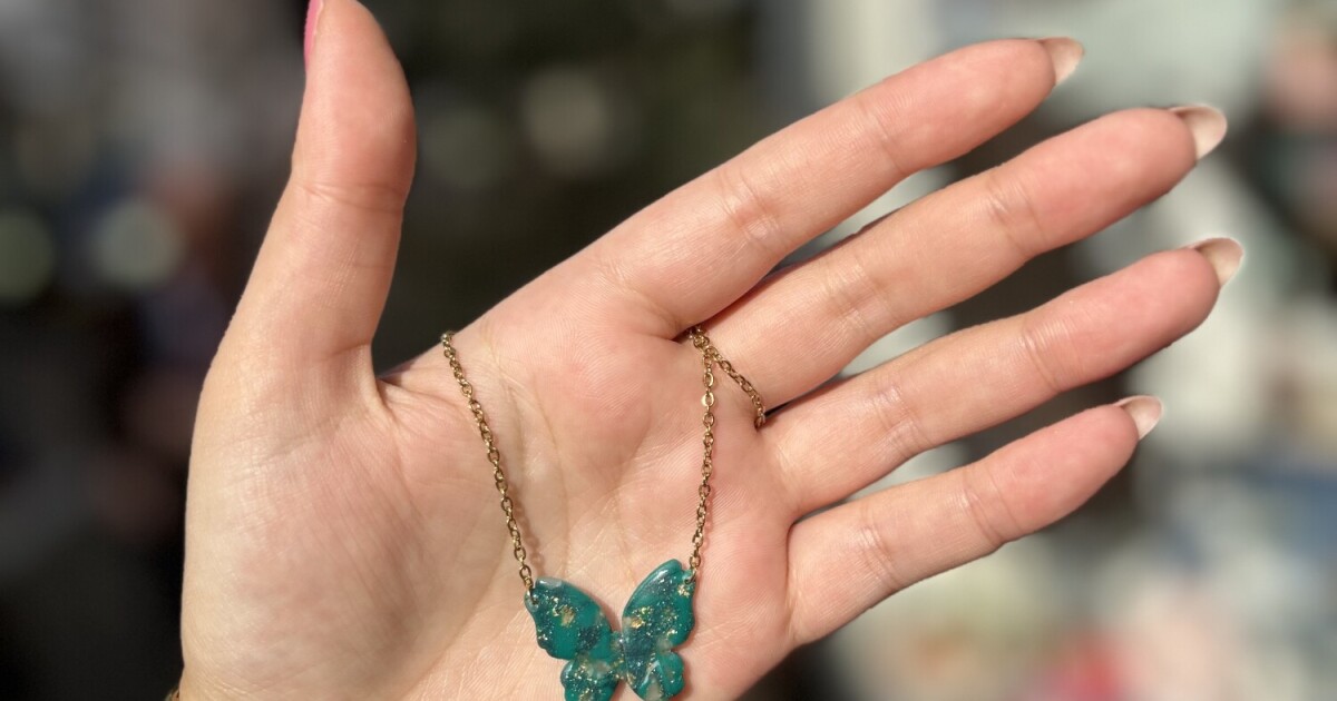 Deze prachtige handgemaakte ketting heeft een delicate vlindervorm, gemaakt van twee tinten turquoise polymeer klei en transparante accenten. De vleugels zijn verfijnd afgewerkt met subtiele bladgoud details, wat de ketting een elegante en dromerige uitstraling geeft. De kleuren en het doorzichtige effect zorgen voor een licht en speels karakter, alsof de vlinder echt tot leven komt.