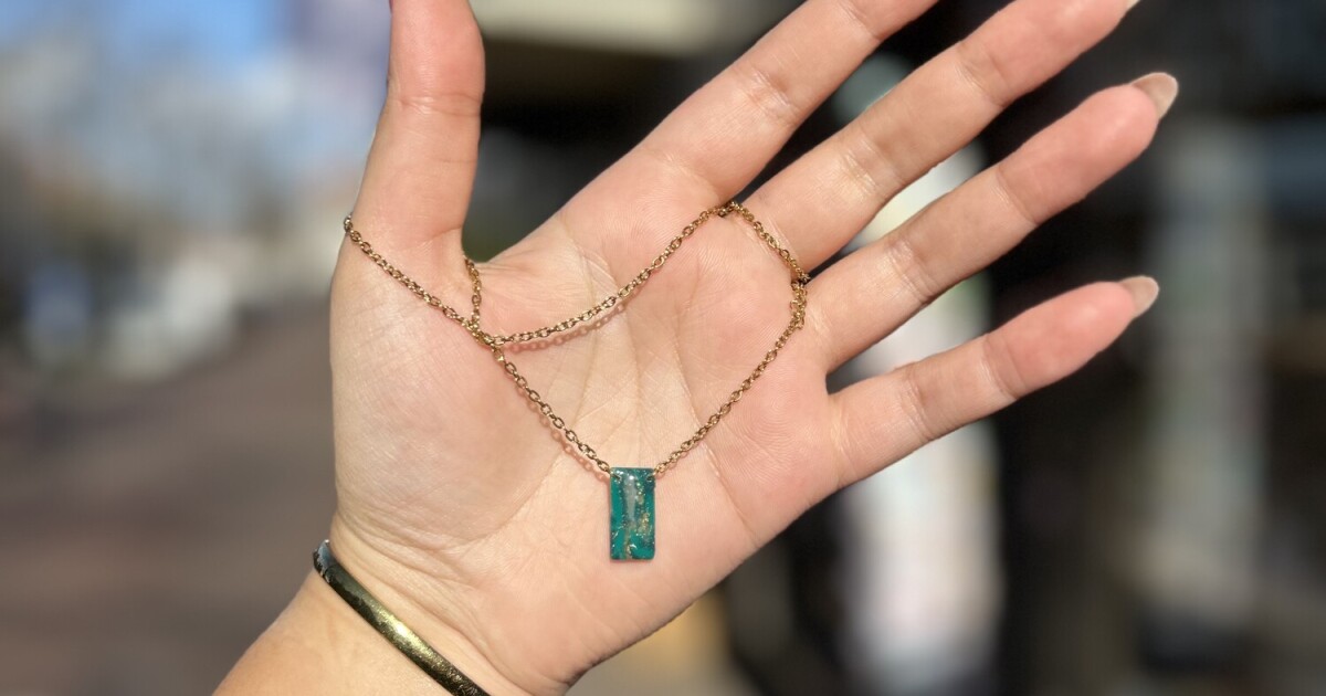 Deze unieke ketting is met de hand vervaardigd uit polymeer klei in twee schitterende tinten turquoise, gecombineerd met een transparant accent. De verfijnde bladgoud details voegen een sprankelend en elegant element toe aan het geheel.